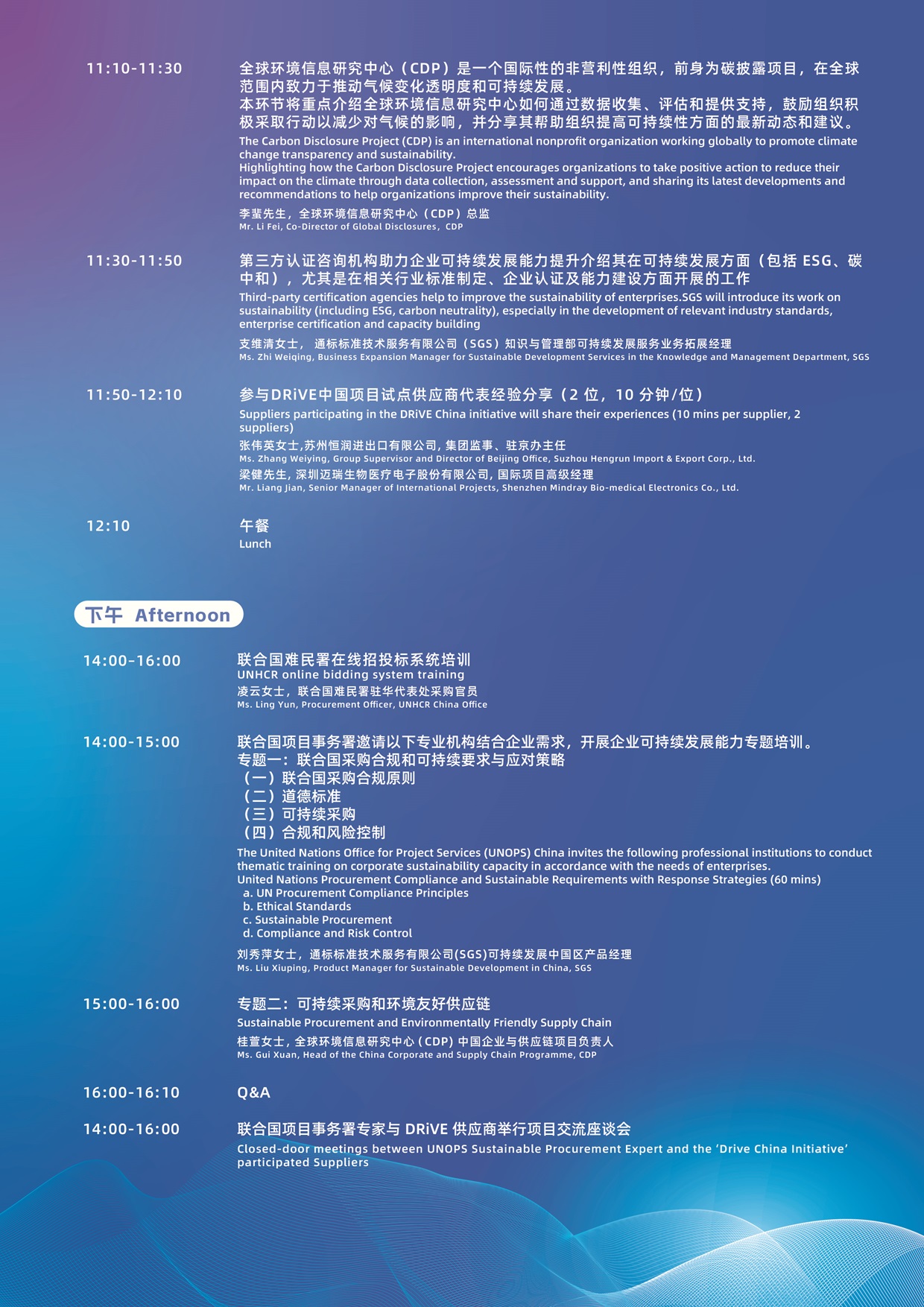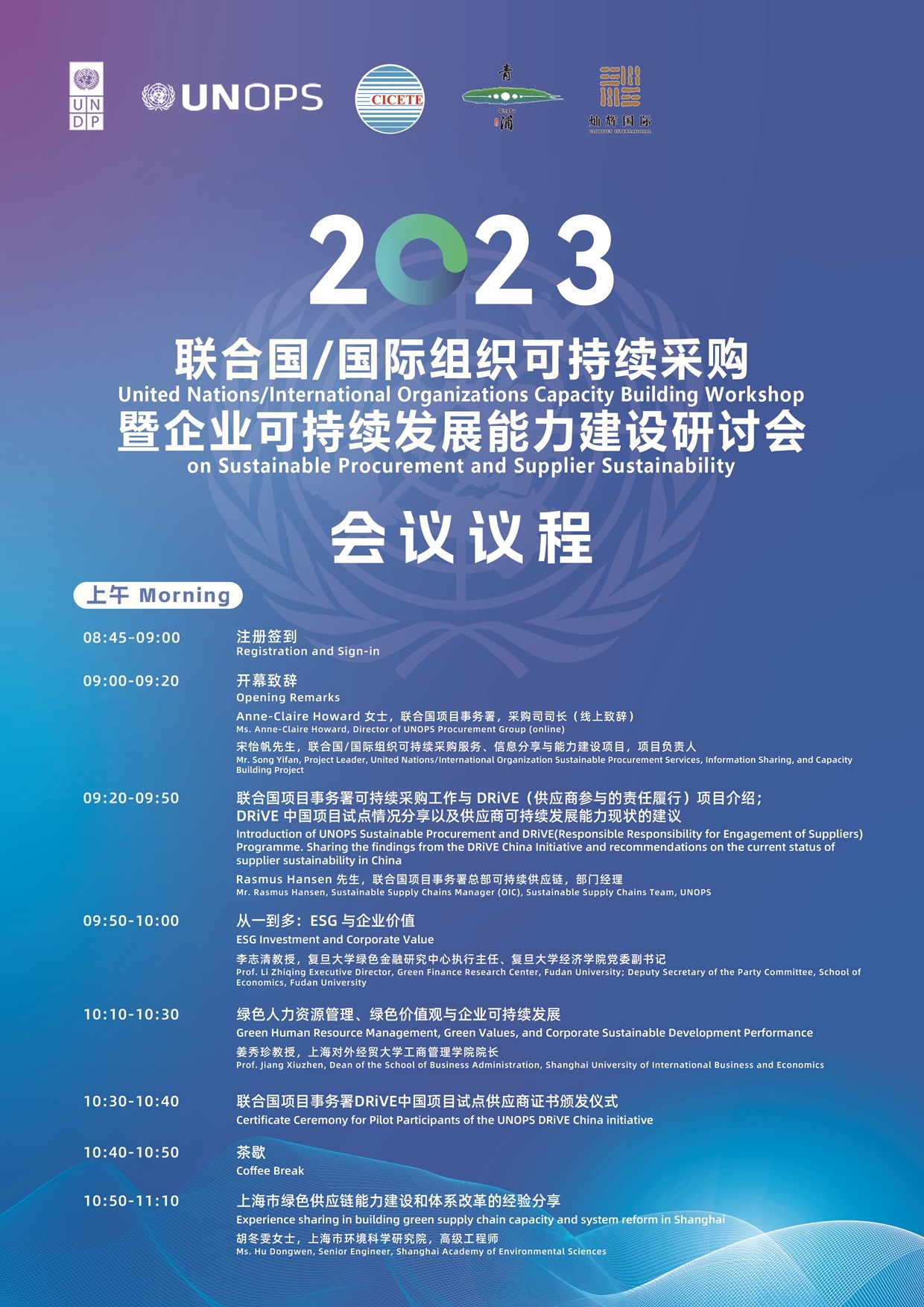 通过介绍联合国/国际组织在可持续采购以及促进采购工作可持续发展方面的最新倡议和计划,以及联合国项目事务署开展的可持续采购工作,特别是 DRiVE(供应商参与的责任履行)项目在中国的实践案例,以帮助中国企业推进可持续发展。研讨会还将邀请相关国际机构、非政府组织、第三方咨询机构和企业代表分享可持续能力方面的相关信息、知识和实践,帮助中国企业,特别是中小型企业与女性创办企业,持续提升自身可持续发展能力,同时加强在 ESG(环境、社会、企业治理)领域多维度、全方位的能力建设。